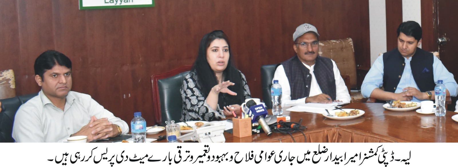 لیہ ( نمائندہ لیہ ٹی وی )وزیر اعلیٰ پنجاب مریم نواز شریف سے ضلع لیہ میں میڈیکل کالج کے قیام کے حوالہ سے گذارشات کی جا چکی ہیں۔ مدر اینڈ چائلڈ ( جنرل) ہسپتال تکمیل کے مراحل میں ہے۔ ضلع کا ماسٹر پلان بہت جلد مکمل ہو جائے گا۔ وزیر اعلیٰ ستھرا پنجاب پروگرام کے سلسلہ میں تحصیل لیہ اور کروڑ کو آؤٹ سورس کر رہے ہیں۔ یہ بات ڈپٹی کمشنر امیرا بیدار نے کمیٹی روم میں میٹ دی پریس کے دوران گفتگو کرتے ہوئے کہی۔ اس موقع پر ایڈیشنل ڈپٹی کمشنرز شاہد ملک ، شبیر احمد ڈوگر ، اسسٹنٹ کمشنر لیہ حارث حمید خان بھی موجود تھے۔ ڈپٹی کمشنر نے کہا کہ موضع راکھواں کو دریائی کٹاؤ سے بچانے کے لئے سٹڈ بند تعمیر کئے جا رہے ہیں اور بہت جلد بیٹ مونگڑ کو کٹاؤسے بچانے کے لئے عملی اقدامات ہوں گے۔ انہوں نے کہا کہ سینٹری ورکرز کی بائیو میٹرک حاضری کو یقینی بنانے کے لئے ڈیوائسز منگوائی جا رہی ہیں تاکہ صفائی کے نظام کو بہتر بنایا جا سکے۔ ڈپٹی کمشنر نے کہا کہ ایم ایم روڈ کی تکمیل کے لئے حکام بالا سے رابطہ میں ہیں۔ انہوں نے ایک سوال کے جواب میں کہا کہ ضلع کو نہری پانی کی دستیابی کے لئے تھل کینال کے پراجیکٹ کو ٹیک اپ کیا جائے گا۔ ڈپٹی کمشنر نے کہا کہ حکومت پنجاب ہر شعبہ زندگی خصوصاً صحت اور تعلیم کے شعبہ پر فوکس کیا ہوا ہے اور ضلع میں صحت سہولیات کی فراہمی کے لئے ہر ممکن کوشش کی جا رہی ہے۔ ڈپٹی کمشنر نے مزید کہا کہ انتظامیہ اور میڈیا کا نقطہ نظر عوام کے مسائل کا حل ہے جس کے لئے نشاندہی کردہ مسائل کو حل کرنے کے لئے باہمی رابطہ کاری سے جاری رکھا جائے گا۔