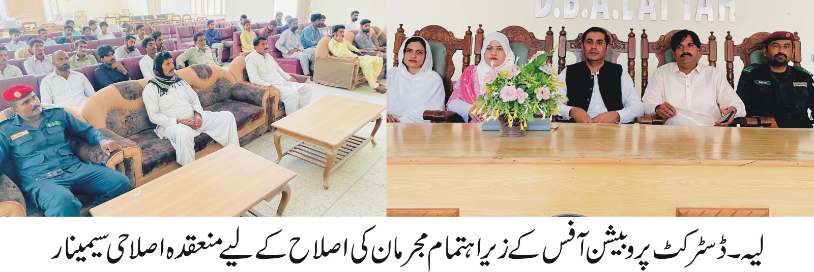 لیہ( نمائندہ لیہ ٹی وی) ڈسٹرکٹ پروبیشن آفس کے زیر اہتمام مجرمان کی اصلاح کے لیے ایک اصلاحی سیمینار کا انعقاد کیا گیا جس میں پروبیشن افسران محمد فیصل شہزاد ،رافعہ یاسین،سائیکالوجسٹ ڈاکٹر شازیہ نواز ، اسسٹنٹ ڈائریکٹر سوشل ویلفیئر ڈیپارٹمنٹ مخدوم جاوید عباس، اسسٹنٹ ڈائریکٹر پنجاب پروبیشن اینڈ پیرول سروس شاہد اسماعیل ،ریسکیو 1122 سے رزاق اقبال اور عمران بشیرنے شرکت کی۔مقررین نے پروبیشنرز کی اصلاح کو مدنظر رکھتے ہوئے اپنے ادارے کا تعارف کروایا اور ضلع لیہ میں ان کی ادارے کی طرف سے پروبیشنرز کو ملنے والی سہولیات سے آگاہ کیا ڈاکٹر شازیہ نواز نے پروبیشنرز کے نفسیاتی مسائل سنے اور ان کو بتایا کہ انسان کا عمل کس طرح سے ان کی سوچ کی عکاسی کرتا ہے۔پروبیشن افسران لیہ نے تمام سپیکر ز کا شکریہ ادا کیا اور مستقل بنیادوں پر ایسے سیمینار کروانے کے عزم کا اظہار کیا