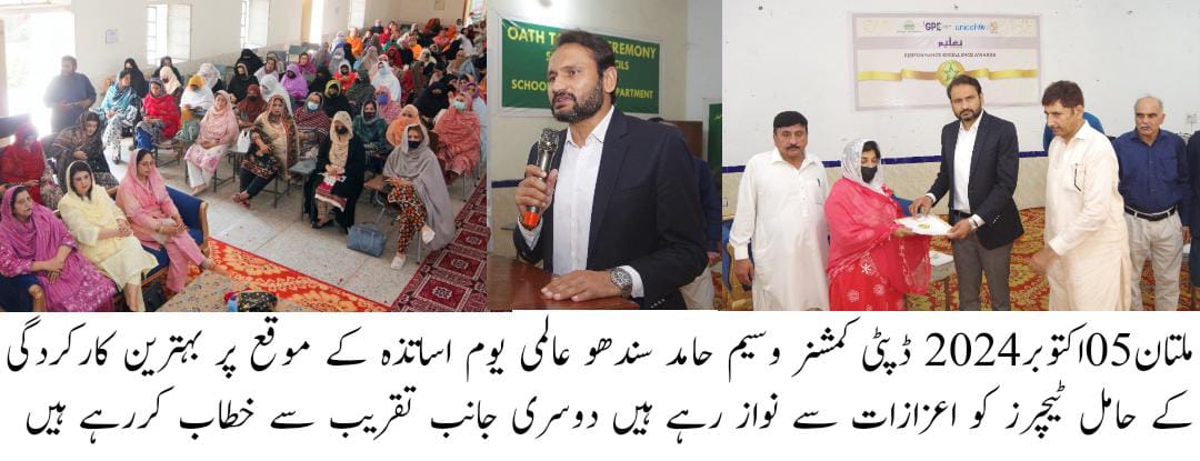 ملتان(لیہ ٹی وی)حکومت پنجاب کی ہدایت پر ضلعی انتظامیہ کے زیر اہتمام عالمی یوم اساتذہ کے موقع پر مرکزی تقریب کا انعقاد کیا گیا۔ڈپٹی کمشنر وسیم حامد سندھو نے بہترین کارکردگی کے حامل اساتذہ اور سکول سربراہان میں اعزازات تقسیم کئے۔عالمی یوم اساتذہ پر تقریب سے خطاب کرتے ہوئے ڈپٹی کمشنر وسیم حامد سندھو نے کہا کہ عالمی یوم اساتذہ کے موقع پر تمام ٹیچرز کو سلام پیش کرتے ہیں۔ٹیچرز نئے عزم سے نسل نو کی آبیاری میں اپنا کردار ادا کریں۔وسیم حامد سندھو کا کہنا تھا کہ حکومت پنجاب نے اساتذہ کرام کو سہولیات فراہمی کیلئے عملی اقدامات کئے ہیں کیونکہ کوئی بھی معاشرہ اساتذہ کرام کو عزت دیے بغیر ترقی کی منازل طے نہیں کرسکتا۔وسیم حامد سندھو نے بعد ازاں ضلع بھر کے نمایاں پوزیشن ہولڈرز طلباءمیں ہیرو ایورڈز اور سرٹیفکیٹ تقسیم کئے