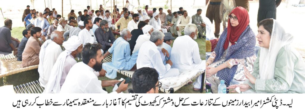 لیہ ۔ زمینوں کے تنازعات کے حل کے لئے وزیراعلیٰ پنجاب کا انقلابی قدم ۔مشترکہ کھیوٹ کی تقسیم کاآغازکردیاگیا۔اس سلسلہ میں تحصیل کروڑ 94ایم ایل میں سیمینار منعقدہوا۔ سیمینار کی مہمان خصوصی ڈپٹی کمشنر امیرا بیدارتھی۔سیمینار میں اسسٹنٹ کمشنر انعم اکرم،ڈپٹی ڈائریکٹرڈویلپمنٹ کامران جاویدموجود تھے۔ ڈپٹی کمشنر امیرا بیدارنے سیمینار سے خطاب کرتے ہوئے کہاکہ حکومت پنجاب نے پلس پراجیکٹ کے تحت مختلف اضلاع میں مر حلہ وارمشترکہ کھیوٹ کی تقسیم کاعمل شروع کردیا ہے تاکہ اراضی ریکارڈ میں ایک مالک، ایک ونڈا کی حوصلہ افزائی کی جا سکے زمینوں کے تنازعات کے خاتمے اور زرعی اراضی کی تقسیم کے لیے اپنے متعلقہ اراضی ریکارڈ سنٹر سے آگا ہی حاصل کریںمشترکہ کھاتوں کی تقسیم پر عائد فیس بھی ختم کردی گئی ہے۔ڈپٹی کمشنر نے مزید کہاکہ اپنے گا وں میں آنے والے ریونیوعملے اور نمبرداران سے تعاون کریںاپنے اراضی حقوق کے بہتر تحفظ کے لیے سمجھداری کا مظاہرہ کریں اور تقسیم کے عمل کو مکمل کروائیں۔اس موقع پر ریونیوعملہ اور کثیر تعداد میں شہریوں نے شرکت کی۔