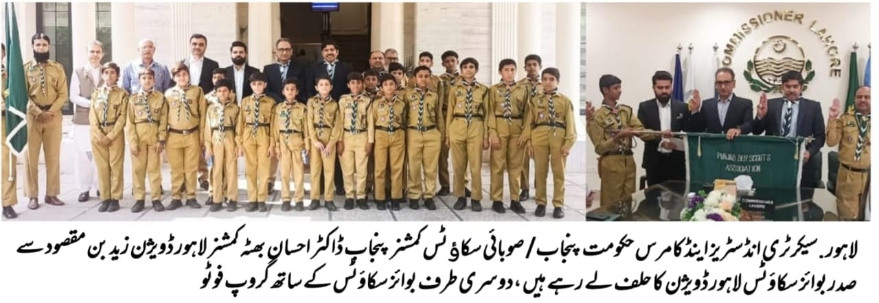 لاہور (لیہ ٹی وی) کمشنر لاہور ڈویژن زید بن مقصود نے صدر بوائز سکاوٹس لاہور ڈویژن کا حلف اٹھا لیا۔سیکرٹری انڈسٹریز اینڈ کامرس حکومت پنجاب و صوبائی کمشنر بوائز سکاوٹس پنجاب ڈاکٹر احسان بھٹہ نے حلف لیا. تقریب حلف برداری کمشنر لاہور آفس سنبل ہال میں منعقد ہوئی۔ اس موقع پر گفتگو کرتے ہوئے کمشنر لاہور ڈویژن زید بن مقصود نے کہا ہے کہ قائداعظم محمد علی جناح چیف سکاوٹ تھے۔ہمیں انکے اتحاد تنظیم اور یقین کے اصولوں پر عمل کرنا ہے۔ صوبائی کمشنر بوائز سکاوٹس ڈاکٹر احسان بھٹہ نے کہا کہ سکاوٹس کو ایسی تربیت دی جاتی ہے کہ وہ مشکل حالات و چیلنجنگ ماحول میں بھی کامیاب رہیں۔دوسروں کی مدد ہماری اسلامی، اخلاقی، قومی اور معاشرتی اقدار کا اہم ترین پہلو ہے۔کمشنر لاہور زید بن مقصود نے کہا کہ لاہور ڈویژن میں سکاوٹس سکول و کالج سطح پر نظم وضبط کی بہترین مثال ہیں۔کمشنر لاہور نے کہا کہ بوائز سکاوٹس کیلئے ڈویژنل و ضلعی سطح پر کونسل پروگرام ترتیب دیے جائیں گے۔لاہور ڈویژن کے ڈپٹی کمشنرز سکاوٹس باڈیز کو ضلعی سطح پر ازسر نو منظم کرنے میں مکمل سرپرستی کریں گے۔ شجرکاری مہم، صفائی مہم میں بوائز سکاوٹس اہم آگاہی کردار ادا کرسکتے ہیں۔اس کے ساتھ بوائز سکاوٹس کے کیمپس کیلئے ڈویژنل سطح پر بھی انتظامات کیے جائیں گے.تقریب حلف برداری میں پنجاب بوائز سکاوٹ کونسلز کے تمام عہدیداران سمیت ایڈیشنل کمشنر ریونیو عثمان غنی۔اے ڈی سی جی لاہور شجعین وسترو۔سی ای او سکول ایجوکیشن لاہور۔ڈائریکٹر کالجز نے شرکت کی