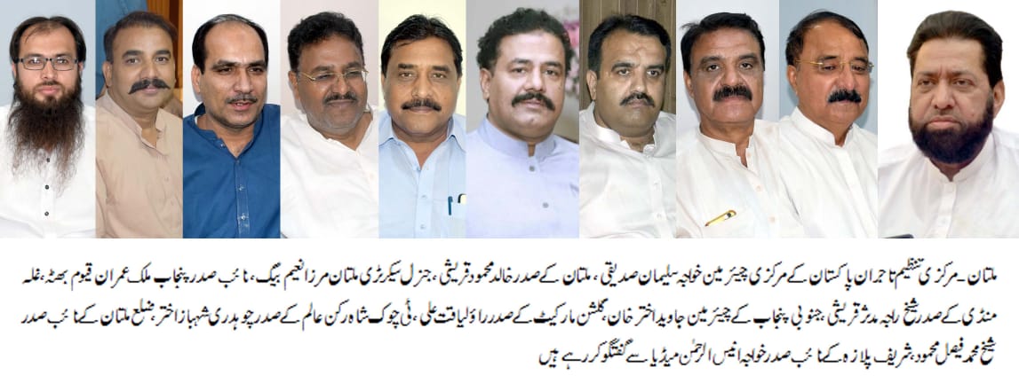 ملتان۔مرکزی تنظیم تاجران پاکستان کے مرکزی چیئرمین خواجہ سلیمان صدیقی، ملتان کے صدر خالد محمود قریشی،جنرل سیکرٹری ملتان مرزا نعیم بیگ،نائب صدر پنجاب ملک عمران قیوم بھٹہ،غلہ منڈی کے صدر شیخ راجہ مدثر قریشی،جنوبی پنجاب کے چیئرمین جاوید اختر خان، گلشن مارکیٹ کے صدر راؤ لیاقت علی،ٹی چوک شاہ رکن عالم کے صدر چوہدری شہباز اختر،ضلع ملتان کے نائب صدر شیخ محمد فیصل محمود، شریف پلازہ کے نائب صدر خواجہ انیس الرحمن میڈیا سے گفتگو کررہے ہیں