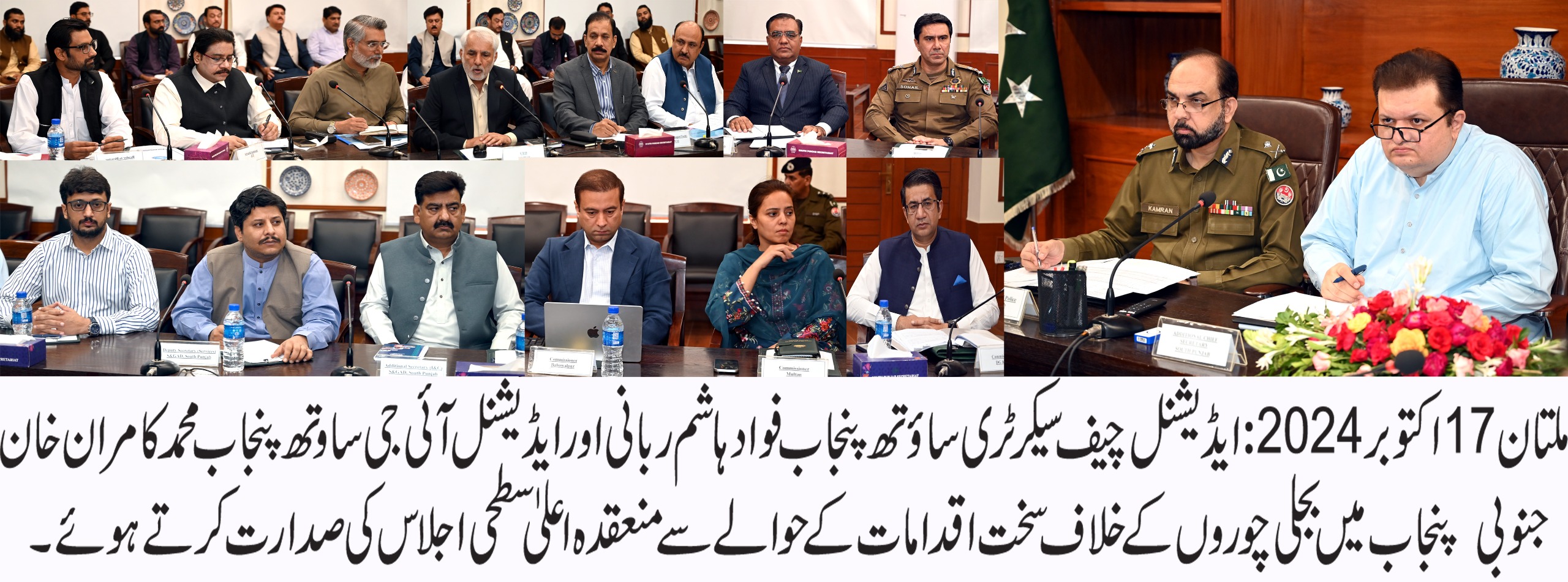 وفاقی حکومت نے بجلی چوروں کے خلاف سخت کریک ڈاون کی ہدایات جاری کی ہیں۔ انہوں نے بتایا کہ بچلی چوری کی صورت میں لائن لاسسز کا بوجھ عام صارف کو برداشت کرنا پڑتا ہے اور اس طرح حکومت کے اقدامات کی وجہ سے مہنگائی کی شرح میں ہونیوالی کمی بجلی بلوں کے بوجھ تلے دب جاتی ہے۔ فواد ہاشم ربانی نے کہا کہ بجلی سستی کرنے کے لئے حکومت آئی پی پیز کے ساتھ از سر نو معاہدے کررہی ہے اور اس صورتحال میں بجلی چوری روک کر عوام کو مزید ریلیف فراہم کیا جا سکتا ہے۔ ایڈیشنل چیف سیکرٹری ساوتھ پنجاب نے ہدایت کی کہ بجلی چوروں کے خلاف کاروائی کے لئے مختلف سیکیورٹی ایجنسیوں پر مشتمل ٹیموں کو مکمل سپورٹ فراہم کی جائےگی اور تمام کمشنرز میپکو کے واجبات اور جرمانوں کی وصولی کے لئے ریونیو افسران کو متحرک کریں اور واجبات ادا نہ کرنے والوں کی جائیدادیں قرق کر لی جائیں۔ ایڈیشنل آئی جی پولیس جنوبی پنجاب محمد کامران خان نے کہاکہ پولیس کو بجلی چوروں کے خلاف درخواست پر فوری ایف آئی آر درج کرنے کی ہدایت دی گئی ہیں اور بجلی چوروں کے خلاف چھاپوں کے لئے خصوصی نفری فراہم کی گئی ہے۔کمشنر ڈی جی خان ڈاکٹر ناصر محمود بشیر نے کہا کہ ریونیو کاروائی کےلئے میپکو بچلی چوری کرنے والے کا مکمل ڈیٹا فراہم کیا کرے۔کمشنر ملتان مریم خان نے کہا کہ ملتان ڈویژن میں میپکو کو انتظامیہ کی مکمل سپورٹ حاصل ہے۔ کمشنر بہاولپور نادر چٹھہ نے کہا کہ بہاولپور ڈویژن میں 90 فیصد بجلی چوروں کو گرفتار کیا گیا ہے۔انہوں نے کہا کہ بجلی چوری روکنے کےلئے آوٹ دی باکس اقدامت کی ضرورت ہے۔ سی ای او میپکو جام گل محمد زاہد نے اجلاس کو بریفنگ دیتے ہوئے بتایا کہ میپکو لائن لاسسزکی شرح 15.2 فیصد ہے۔گزشتہ ایک سال میں میپکو ریجن میں 40869 بجلی چوروں کے خلاف کاروائی کی گئی اور 39900 بجلی چوروں کے خلاف ایف آئی درج کرائی گئ جبکہ 31536 بجلی چور گرفتار کئے گئے۔انہوں نے بریفنگ میں مزید بتایا کہ بجلی چوروں کو 2ارب 62 کروڑ60 لاکھ روپے جرمانہ کیا گیا اور اب تک1 ارب69 کروڑ 90 لاکھ روپے وصول کئےگئے ہیں۔