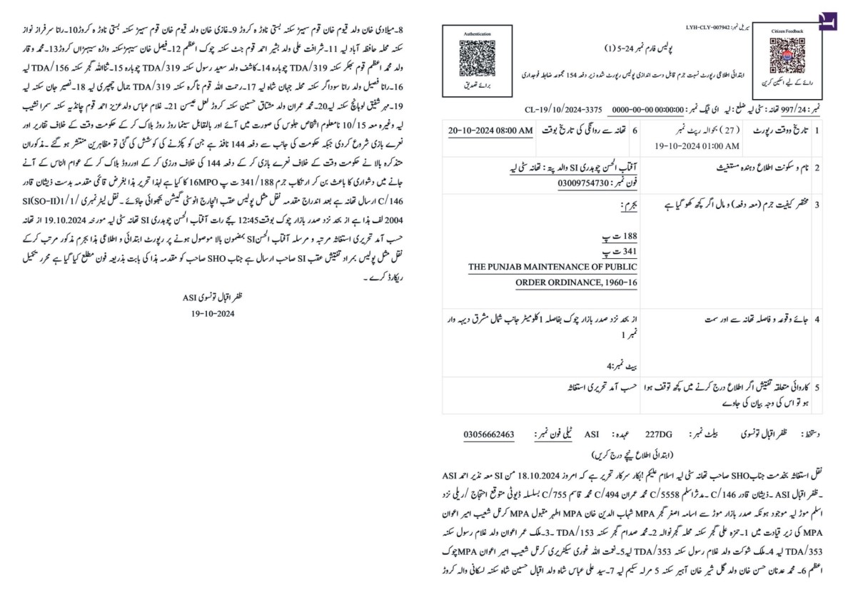 لیہ(نمائندہ لیہ ٹی)پاکستان تحریک انصاف کی احتجاجی ریلی،دفعہ 144 کی خلاف ورزی ،حکومت کے خلاف نعرہ بازی،روڈ بلاک کرنے پر 3ایم پی ایز اسامہ اصغر گجر،شہاب الدین خان سیہڑ، ملک شعیب امیر اعوان،ضلعی جنرل سیکرٹری رانا فیصل مسعود سمیت23 مظاہرین پر نامزد 15 سے 20 نامعلوم افراد کے خلاف تھانہ سٹی میں مقدمہ درج کر لیا گیا،سب انسپکٹر آفتاب الحسن کی مدعیت میں درج ایف آئی آر کے مطابق ایم پی ایز اسامہ اصغر گجر، شہاب االدین خان سیہڑ ،ملک شعیب امیر اعوان کی قیادت میں حمزہ علی گجر، ملک عمر عوان، ملک شوکت، نعمت اللہ غوری، محمد عدنان حسن خان، سید علی عباس شاہ، میلادی خان، غازی خان، رانا سرفراز نواز، شرافت علی، فیصل خان سیہڑ، محمد وقار کاشف، ثنا اللہ گجر، رانا فیصل مسعود، رحمت اللہ ، نصیر جان، مہر شفیق لوہانچ، محمد عمران ، غلام عباس شامل ہیں جبکہ 15 سے 20 افراد نامعلوم نے سینما روڈ بلاک کر کے حکومت وقت کے خلاف تقاریر اور نعرے بازی کی جب کہ حکومت کی جانب سے دفعہ 144 نافذ ہے جن کو پکڑنے کی کوشش کی تو مظاہرین منتشر ہو گئے حکومت کے خلاف نعرے بازی پر اور دفعہ 144 کی خلاف ورزی روڈ بلاک کرنے کر کے عوام الناس کو آنے جانے میں دشواری کا باعث بن کر ارتکاب جرم 341 ت پ188ت پ اور 16 ایم پی اوکے تحت تھانہ سٹی لیہ میں مقدمہ درج کیا گیا ہے،ضلع پولیس گرفتاریو ں کیلئے چھاپے مار رہی ہے آخری اطلاعات کے مطابق ضلع پولیس نے ممبر صوبائی اسمبلی سردارشہاب الدین خان سیہڑ کے ڈیرے پر چھاپہ مار کر عدنان آہیر ،منشی عمران اور محمد عباس کو گرفتار کر لیا ہے۔