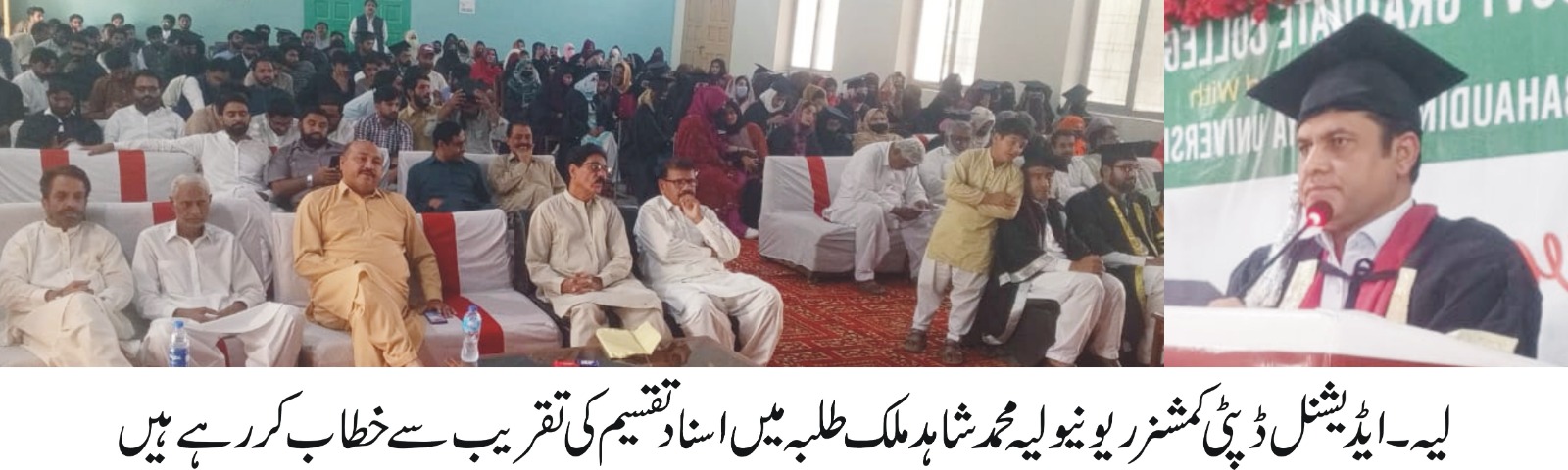 لیہ(نمائندہ لیہ ٹی وی)گورنمنٹ پوسٹ گریجویٹ کالج لیہ میں بہاؤدین زکریا یونیورسٹی ملتان کی ایفیلییشن کے تحت پاس ہونے والے گریجویٹ طلبہ میں اسناد کی تقسیم کی تقریب منعقدہوئی ۔ تقریب کے مہمان خصوصی ایڈیشنل ڈپٹی کمشنر ریونیو لیہ محمد شاہد ملک نے گریجویٹ طلبہ میں اسناد تقسیم کی۔تقریب میں ڈپٹی ڈائریکٹر کالجزذوالفقار حیدری، پرنسپل گورنمنٹ پوسٹ گریجویٹ کالج ڈاکٹرسجاد حسین ،اساتذہ، طلبا و طالبات کی بڑی تعداد نے کانوکیشن میں شرکت کی۔