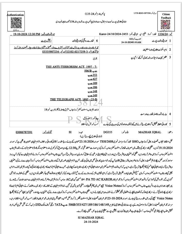 لیہ(نمائندہ لیہ ٹی وی)سابق صدر بار ایسوسی ایشن کروڑصدیق اکبر کھرل ایڈووکیٹ کے خلاف تھانہ کروڑ میں مقدمہ درج ،کروڑ پولیس نے گرفتار کر لیا۔تھانہ کروڑ میں تحصیلدارمحال عمر خان کی مدعیت میں درج ایف آئی آر کے مطابق اسسٹنٹ کمشنر کروڑ اپنے دفتر میں میٹنگ کررہی تھیں کہ صدیق اکبر کھرل 5 سے 6 افراد کے ہمراہ دفتر میں داخل ہوئے اور اور اپنا کام اپنی مرضی سے کروانے پر زور دینا شروع کردیا جس اسسٹنٹ کمشنر کروڑ انعم اکرم نے اگلے دن اپنے ریکارڈ سمیت تحصیلدار آفس میں آنے کیلئے کہا تاکہ بمطابق قانون کاروائی عمل میں لائے جائے ،جس پر صدیق اکبر ایڈووکیٹ اور اس کے ساتھیوں نے دھمکیا ں دینا گالم گلوچ کرنا اور پستول تان کرجان مارنے کا کہنے لگے اور میز پر موجود سرکاری اہم ترین دستاویزات کو پھاڑنے لگے جس سے سرکاری اہم ترین ریکارڈ ضائع ہوگیا دفتر میں خوف وہراس پھیل گیادفتر کے عملہ نے پیچ بچائو اور منت سماجت کے بعد ان لوگوں کو دفتر سے نکالا بعد میں ان لوگوں نے واٹس ایپ کے ذریعے وائس نوٹس کے ذریعے دھمکیاں ،گالم گلوچ بھی کیں،تھانہ کروڑ پولیس نے سابق صدر تحصیل بار ایسوسی ایشن کروڑ صدیق اکبر اور اس کے ساتھیوں کے خلاف دہشت گردی کی دفعات ،506Bت پ،353 ت پ ،427 ت پ،189ت پ، 186ت پ، 148ت پ، 149 ت پ اور 25Dکے تحت مقدمہ درجھ کرکے صدیق اکبر کھرل ایڈووکیٹ کو گرفتار کرلیا ،آخری اطلاعات کے مطابق تحصیل بارایسوسی ایشن کروڑ نے ہنگامی اجلاس طلب کرلیا ، احتجاج اور ہڑتال کا بھی فیصلہ کیا