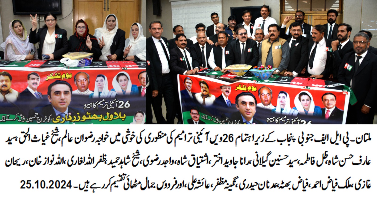 ملتان(لیہ ٹی وی)ڈسٹرکٹ بار ملتان میںپی ایل ایف جنوبی پنجاب کے زیر اہتمام 26ویں آئینی ترامیم کی منظوری کی خوشی میں مٹھائی تقسیم کرنے کی تقریب سے مرکزی راہنماءپیپلز پارٹی خواجہ رضوان عالم،صدر پی ایل ایف جنوبی پنجاب شیخ غیاث الحق،جنرل سیکرٹری ڈسٹرکٹ بار ملتان سید عارف حسن شاہ،ظل فاطمہ، سید حسنین گیلانی،رانا جاوید اختر،اشتیاق شاہ،واجد رضوی،شیخ شاہد حمید،ظفر اللہ لغاری،اللہ نواز خان،ریحان غازی،ملک فیاض احمد،فیاض بھٹہ،عدنان حیدری،نگینہ مظفر،عائشہ علی،فردوس جمال،رضوان ہانس،صفدر سرسانہ،کنور وسیم،آسیہ گل،فیروزہ فیض،راؤ قمر،مشتاق بلوچ اور مہر سجاد حسین نے خطاب کرتے ہوئے کہا کہ 26 ویں آئینی ترمیم کی منظوری کا تمام تر سہرا بلاول بھٹو زرداری کے سر ہے انہوں نے اپنی سیاسی بصیرت کو استعمال کرتے ہوئے آئینی ترمیم کی منظوری کے لئے تمام سیاسی جماعتوں کو ایک پلیٹ فارم پر اکٹھا کیا اوربے نظیر بھٹو کے میثاق جمہوریت ایجنڈے کو پایہ تکمیل پہنچایا اس آئینی ترمیم کا تصور قائد اعظم محمد علی جناح نے پیش کیا تھا جوڈیشل ریفارمز کی بدولت عوام کو جلد انصاف کی فراہمی اور آمریت کو روکنے میں مدد ملے گی آئینی ترامیم کا فیصلہ سیاسی تاریخ میں سنہری حروف میں لکھا جائے گا عد ازاں مٹھائی تقسیم کی گئی