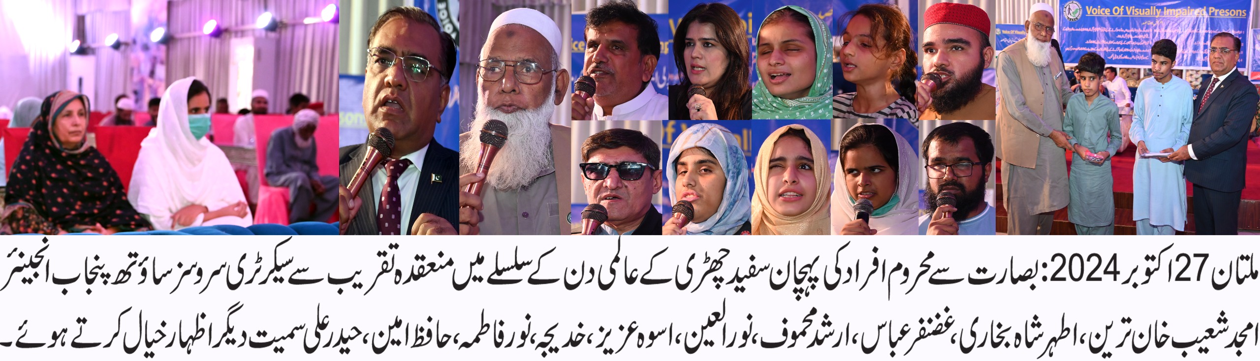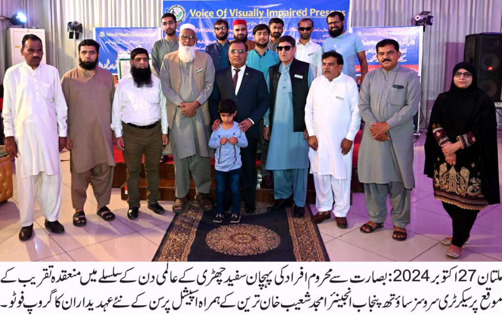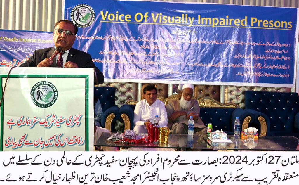 "وائس آف ویژیولی ایمپیرڈ پرسنز” کے چئیرمین غضنفر عباس،چیف ایڈوائزر ارشد محمود اور تنظیم کے پیٹرن انچیف و سابق صدر ہائیکورٹ بار اطہر شاہ بخاری بھی تقریب میں موجود تھے۔سیکرٹری سروسز ساوتھ پنجاب انجینئیر امجد شعیب خان ترین نے اس موقع پر اپنے خطاب میں کہا کہ سفید چھڑی کےدن کو منانے کا مقصد معاشرے کو نابینا افراد کی مشکلات سے آگاہ کرنا ہے۔ہر شہری پر فرض ہے کہ سفید چھڑی تھامے نابینا افراد سڑک پر چلتے نظر آئیں تو ان کی رہنمائی کی جائے۔ انہوں نے کہا وزیراعلی مریم نواز شریف کی جانب سے خصوصی افراد کے معاشی مسائل کے حل کے لئے ہمت کارڈ کا اجراء ایک انقلابی اقدام ہے۔
