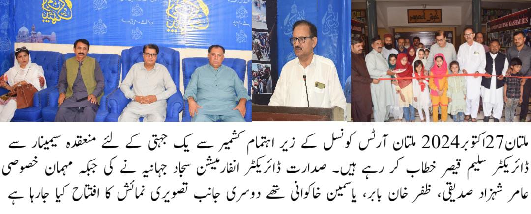 ملتان(لیہ ٹی وی)ڈائریکٹر تعلقات عامہ ملتان سجاد جہانیہ نے کہا ہے کہ آج سے 77 برس قبل 27 اکتوبر کو بھارت نے کشمیر پر غاصبانہ قبضہ کرتے ہوئے اس قضیے کی بنیاد ڈالی جو آج پون صدی کے بعد بھی حل طلب ہے۔ مظلوم کشمیری بھارت کے ظلم و جبر کے باوجود آزادی کے لئے لڑ رہے ہیں تاہم وہ دن دور نہیں جب کشمیر میں آزادی کا سورج طلوع ہوگا۔ وہ ملتان آرٹس کونسل کے زیر اہتمام ایک سیمینار سے خطاب کر رہے تھے۔ سیمینار سے قبل بھارتی مظالم پر مبنی ایک تصویری نمائش کا اہتمام بھی کیا گیا۔ سیمینار سے خطاب کرتے ہوئے ڈائریکٹر آرٹس کونسل سلیم قیصر نے کہا کہ ظلم و جبر کو شکست ہوگی، کشمیری عوام حق پر ہیں وہ بھارتی تسلط سے آزادی لے کر رہیں گے۔ پاکستان کے عوام کشمیریوں کے حق آزادی کی بھرپور حمایت کرتے ہیں۔ کالم نگار عامر شہزاد صدیقی نے کہا ظلم و جبر کی طویل داستان نے کشمیر کو خونچکاں کر رکھا ہے۔ بھارت کے ظالمانہ حربوں کی داستان دنیا کو سنانا ہوگی۔ ماہر تعلیم ظفر خان بابر نے کہا 77 برس سے پاکستان کے لوگ اور حکومتیں کشمیر کی آواز بلند کر رہے ہیں مگر عالمی اداروں ک امیر سویا ہوا ہے۔ یاسمین خاکوانی نے کہا کہ کشمیر میں ہونے والے مظالم کی داستان عالمی اداروں تک پہنچانے کے لئے آج پوری قوم پرامن احتجاج کر رہی ہے۔ ڈاکٹر عبدالبصیر نے کہا کہ بین الاقوامی سامراج بھارت کے غاصبانہ قبضے سے صرف نظر اس لئے کرتا ہے کہ بھارت ایک بڑی منڈی ہے۔ تقریب کے آغاز میں حافظ حسین محی الدین نے تلاوت جبکہ محمد احمد مصطفی نے نعت پیش کی#