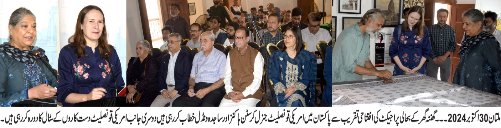 انہوں نے اردو میں کہا کہ میں گھنٹہ گھر کی بحالی کے منصوبہ کا افتتاح کرتی ہوں۔ پروفیسر ساجدہ ونڈل نے کہا کہ یو ایس قونصلیٹ کی فنڈنگ اور والڈ سٹی اتھارٹی کے تعاون سے گھنٹہ گھر کی عمارت میں کرافٹ میوزیم ، لائبریری، کرافٹ مارکیٹ، کیفے اور دست کاری ٹریننگ سنٹر بنایا جائے گا۔ تاریخی بنیادوں پر بحال ہونے کے بعد یہ ایک ثقافتی عوامی مرکز ہوگا جہاں ملتان کے قدیمی دست کاروں کو گھر بھی میسر آئے گا۔ تاہم انہوں نے کہا کہ ملتان کے شہری اس بامقصد پراجیکٹ کو اونر شپ دیں اور ہمیں مشوروں سے نوازیں تاکہ اس عمارت کو ملتان کے ثقافتی اور تاریخی رنگوں کے امتزاج سے نکھارا جا سکے۔ اس موقع پر ملتان کے قدیمی نقاش خاندانوں کے ہنر مندوں استاد باقر نقاش اور استاد عبدالرحمان نقاش نے اپنی خاندانی نقاشی کے قدیم اور نایاب نمونے میوزیم کے لئے پیش کئے۔ قبل ازیں امریکی قونصلیٹ جنرل کرسٹین ہاکنز نے دست کاروں کے سٹالز کا معائنہ کیا اور انہیں کام کرتے ہوئے دیکھا۔ انہوں نے ہنرمندوں کے کام کی تعریف کی اور ان کی تخلیقی صلاحیتوں کو سراہا۔
