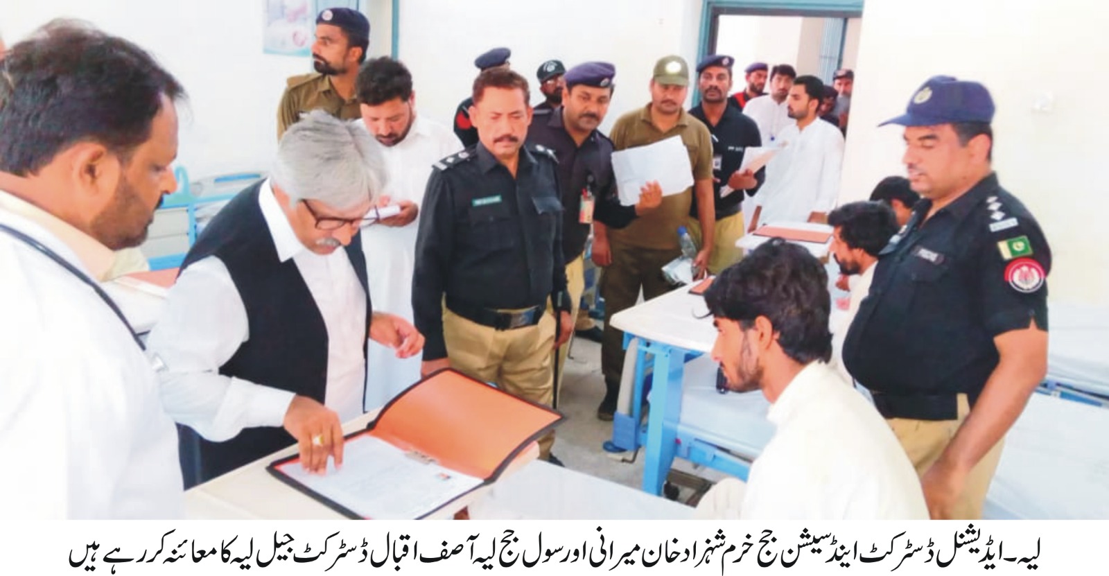 لیہ: ایڈیشنل ڈسٹرکٹ اینڈ سیشن جج لیہ خرم شہزاد خان میرانی اور سول جج لیہ آصف اقبال نے ڈسٹرکٹ جیل لیہ کا دورہ کیا اس موقع پرسپرنٹنڈنٹ جیل محمدمدثر خان ،ڈپٹی سپرنٹنڈنٹ عرفان علی چھینہ موجودتھے۔ججز نے اندرون جیل ہسپتال ، کچن اسیران ،نو عمر وارڈمیں قائم سکول، بارکس،صفائی و ستھرائی،سکیورٹی انتظامات کو چیک کیا اور معمولی جرائم میں ملوث تین قیدیوں کی رہائی کے احکامات جاری کیے