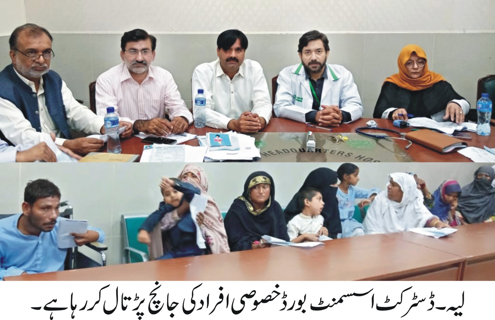 لیہ( نمائندہ لیہ ٹی وی)حکومت پنجاب کی ہدایت پر ڈسٹرکٹ اسسمنٹ بورڈ برائے معذور افراد کا اجلاس ڈی ایچ کیوہسپتال لیہ میں منعقدہوا۔ اجلا س میں میڈیکل سپرنٹنڈنٹ ڈاکٹرغلام محی الدین ،چائلڈاسپیشلسٹ ڈاکٹرام سلمی،ڈپٹی ڈائریکٹر سوشل ویلفیئرمخدوم جاوید عباس،ڈاکٹررشید بھٹی،ڈاکٹرمحمدعزیز،ناصر حسین شاہ ودیگرموجودتھے۔ بورڈ میں120 فزیکل اور دماغی امراض کی درخواستوں پر غور کیا گیا جن میں مکمل فٹنس رپورٹ دیکھنے اور چیک اپ کے بعد75 افراد کوخصوصی افراد قرار کیا گیا،10درخواستیں مسترد کی گئیں، جبکہ 35 درخواست گزار غیر حاضر پائے گئے ہیں۔میڈیکل سپرنٹنڈنٹ ڈاکٹرغلام محی الدین اور،ڈپٹی ڈائریکٹر سوشل ویلفیئرمخدوم جاوید عباس نے کہاکہ بورڈ بغیر کسی دباو¿ یا سفارش کے میرٹ پراپنا کام سرانجام دیتا ہے حکومت پنجاب خصوصی افرادکی فلاح و بہبود کیلئے تر جیحی بنیادوں پر کام کر رہی ہے ۔