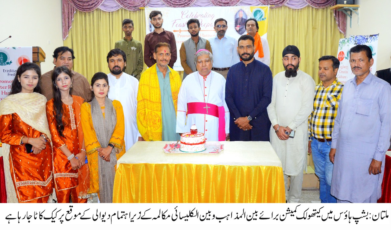 ملتان(لیہ ٹی وی)کیتھولک کمیشن برائے بین المذاہب و بین الکلیسائی مکالمہ پاکستان اور ملتان ڈاؤسیسن ہارمنی فورم کے زیر اہتمام کیتھولک چرچ ملتان میں ہندو برادری کے مذہبی تہوار دیوالی کے موقع پر خصوصی تقریب منعقد کی گئی جس کی صدارت بشپ آف ملتان بشپ یوسف سوہن نے کی جبکہ تقریب میں بکیتھولک کمیشن برائے بین المذاہب و بین الکلیسائی مکالمہ پاکستان کے ایگزیکٹیو سیکریٹری سیموئیل کلیمنٹ،فادر ڈینیئل تاج،سرفراز کلیمنٹ،علامہ ڈاکٹرمحمد ارشد علی بلوچ، پروفیسر عبد الماجد وٹو،بشارت عباس قریشی،پنڈت راج کپو،مہک اجمل، شفیق انصاری،،شہباز ناظم،حنا سلمان، امروز گل،مریم غازی،شازر گل نے بھی شرکت کی۔اس موقع پر گفتگو کرتے ہوئے بشپ یوسف سوہن نے کہا ہے کہ بین المذاہب ہم آہنگی وقت کی اہم ضرورت ہے پاکستان میں بسنے والے تمام مذاہب کے لوگ پرامن اور محب وطن ہیں جو کہ ملک و قوم کی تعمیر وترقی میں اہم کردار ادا کر رہے ہیں انہوں نے کہا کہ ہے کہ آج مجھے نہایت خوشی محسوس ہو رہی ہے کہ کیتھولک چرچ میں مسلم مسیحی علماء کرام مل کر ہندو کمیونٹی کے خوشی کے تہوار دیوالی کو مناکر ہندو قوم کے ساتھ اظہار یکجہتی کر رہے ہیں انہوں نے کہا کہ میں اپنے مسلم۔مسیحی اور ہندو بھائیوں کا شکر گزار ہوں کہ آپ ہمارے دعوت کو قبول کرتے ہوئے تشریف لاکر محب وطن اور امن پسند ہونے کا ثبوت دیتے ہیں۔