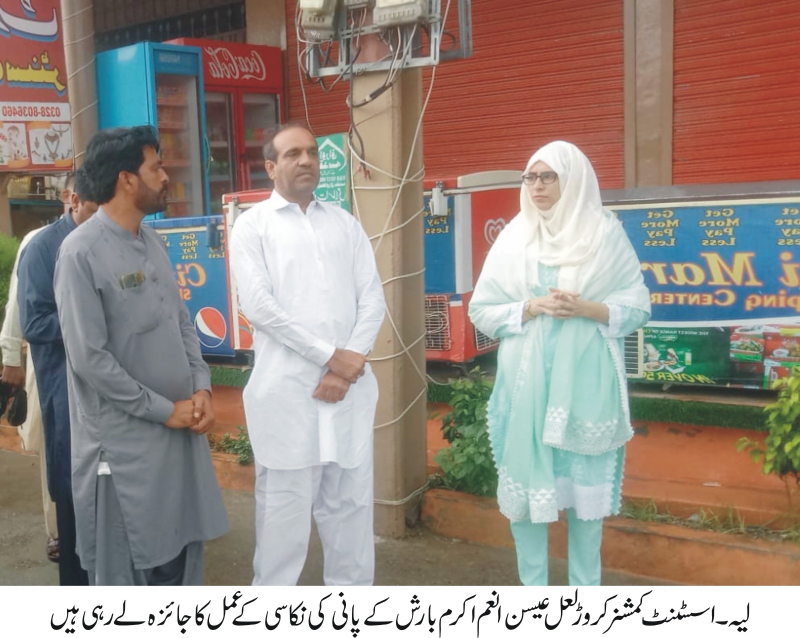 لیہ: اسسٹنٹ کمشنر کروڑ لعل عیسن انعم اکرم نے مختلف گلیوں ،محلوں سڑکات پر صفائی آپریشن کا معائنہ کیا اور بارش کاپانی نکالنے کے عمل کا معائنہ کیا۔اس موقع پر چیف آفیسر میونسپل کمیٹی آصف بھڈوال بھی ہمراہ تھے۔اسسٹنٹ کمشنر کروڑ لعل عیسن انعم اکرم نے کہاکہ ستھراءپنجاب مہم کے بارش کی پانی کی فوراً نکاسی کی جائے انہوں نے کہاکہ میونسپل کمیٹی اپنی تمام ترمشینری کو الرٹ رکھتے ہوئے استعمال میںلائے اور بارش کے پانی کی نکاسی کی جائے تاکہ گلی محلوں کے رہائشیوں کو آنے جانے میں مشکلات کا سامنانہ کرنا پڑے۔