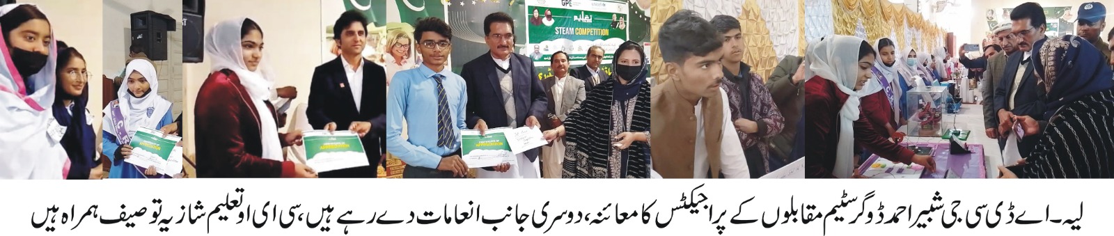 لیہ(نمائندہ لیہ ٹی وی) محکمہ تعلیم کے زیر اہتمام سائنس، ٹیکنالوجی، انجینئرنگ، آرٹ اور میتھ(سٹیم) کے ضلعی مقابلوں کا انعقاد کیاگیا ۔ مقابلے گورنمنٹ ماڈل ہائر سیکنڈری سکول لیہ میں منعقد ہوئے۔ سٹیم مقابلوں کی تقریب میں طلبہ نے بھرپور طریقہ سے شرکت کرتے ہوئے ضلع بھر سے 45 سکولوں کے طلبہ نے حصہ لیا۔ سٹیم مقابلوں میں مختلف پراجیکٹس کے 122 سٹالز لگائے گئے ۔ تقریب کے مہمان خصوصی ایڈیشنل ڈپٹی کمشنر جنرل شبیر احمد ڈوگر نے سٹالز کا معائنہ کیا ۔ چیف ایگزیکٹو آفیسر تعلیم شازیہ توصیف، چیف ایگزیکٹو آفیسر ہیلتھ ڈاکٹر شاہد ریاض، فوکل پرسن سٹیم ڈسٹرکٹ ایجوکیشن آفیسر سیکنڈری رضوان گجر ، ڈی ای او ایلیمنٹری آغا حسن ، ڈپٹی ڈی ای اوز، سینئر ہیڈ ماسٹر آصف خان درانی،اساتذہ،میڈیا نمائندگان موجودتھے۔ تقریب سے خطاب کرتے ہوئے اے ڈی سی جی شبیر احمد ڈوگر نے کہاکہ سٹیم مقابلوں سے طلبہ کی صلاحیتیں ابھر کر سامنے آئی ہیںمقابلوں میں حصہ لینا ہمت حوصلہ اور قائدانہ صلاحیت کی غماز ہے ۔انہوںنے کہاکہ طلبہ کو جدید تقاضوں کے مطابق سائنس وٹیکنالوجی کے علوم سے بہرہ کرنا وقت کاناگزیر تقاضاہے جسے اساتذہ بہترین طریقہ سے اداکررہے ہیں سٹیم پراجیکٹ سے منسلک اساتذہ اور طلبہ داد کے مستحق ہیں۔سی ای او تعلیم شازیہ توصیف نے کہاکہ ضلع کی مٹی بڑی زرخیز اور طلبہ بہت باصلاحیت ہیں طلبہ کو پراجیکٹ پیش کرنے پر شاباش دیتی ہوں۔ تقریب سے فوکل پرسن سٹیم ڈی ای او رضوان گجر اور ڈی ای او ایلیمنٹری آغا حسن نے بھی خطاب کیا۔ مقابلوں میں گورنمنٹ ایم سی ہائی سکول کے طالبعلم آیان نے سٹیم مقابلوں میں لیزر سیکورٹی پراجیکٹ پیش کر کے پہلی پوزیشن حاصل کی ۔ گورنمنٹ گرلز ہائی سکول 152 ٹی ڈی اے کی طالبہ شازیہ نے ویڈنگ پلانٹ کے پراجیکٹ پر دوسری ، گورنمنٹ گرلز ماڈل ہائی سکول لیہ کی نور مصطفیٰ نے زلزلہ کی نشاندہی کے پراجیکٹ پر تیسری پوزیشن حاصل کی۔ اول، دوم اور سوم آنے والے طلبہ کو بالترتیب 30 ہزار، 20 ہزار اور 10 ہزار روپے نقد انعام اور سرٹیفکیٹ دئے گئے جبکہ سٹیم مقابلوں میں حصہ لینے والے تمام طلبہ کو تعریفی اسناد دی گئیں۔تقریب کی میزبانی کے فرائض گورنمنٹ ایم سی ہائی سکول کے استاد ارشاد کھوکھرنے انجام دیے۔