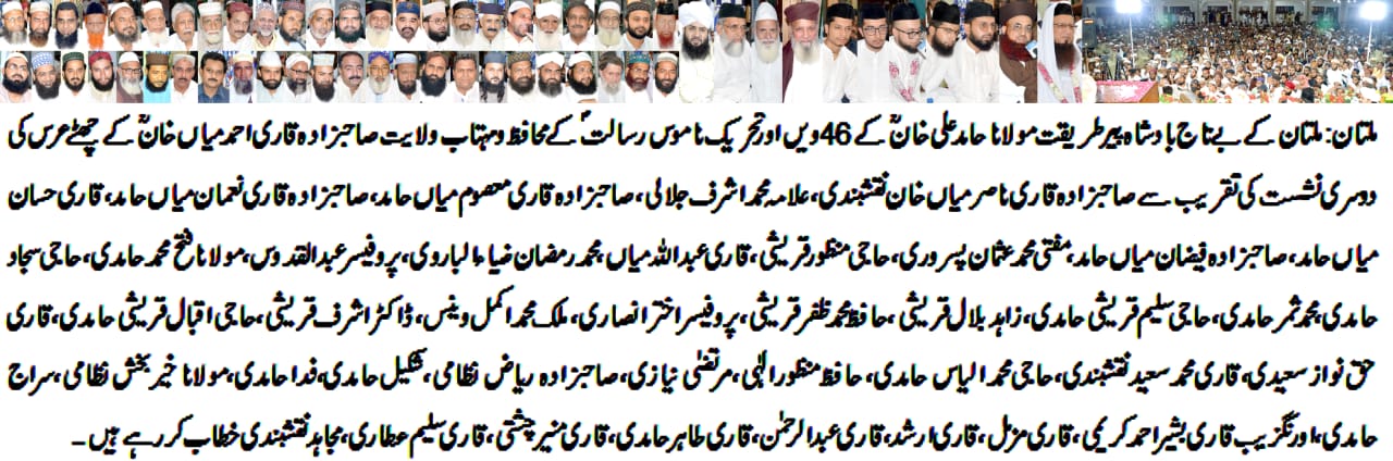 ملتان23اگست ( لیہ ٹی وی) جانشین پیر طریقت صاحبزادہ قاری ناصر میاں خان نقشبندی نے کہا ہے کہ دنیا وآخرت کی کامیابی قرآن وسنت پر عمل کرنے میں ہے اس پرفتن دور میں عقیدے اور عمل کی اصلاح اولیاءاللہ کی تعلیمات کو عام کرنے میں ہے پیر طریقت مولانا حامد علی خاں ؒ اور مہتاب ولایت صاحبزادہ احمد میاں خاں مجددی ؒ نے ساری عمر باطل قوتوں کا مقابلہ کیا خصوصاََ ختم نبوت کے تحفظ اور ناموس رسالت کیلئے گستاخان رسول ﷺ اور فتنہ قادیانیت کا ڈٹ کر مقابلہ کیا اور عشق رسول ﷺ کا پیغام پورے عالم اسلام تک پہنچایا ان خیالات کا اظہار انہوں نے ملتان کے بے تاج بادشاہ پیر طریقت مولانا حامد علی خان ؒ کے 46ویں اور تحریک ناموس رسالت کے محافظ ومہتاب ولایت صاحبزادہ قاری احمد میاں خان ؒ کے چھٹے عرس کی دوسری نشست کی تقریب میں صدارتی خطاب میں کیا سربراہ تحریک لبیک یارسول اللہ پاکستان علامہ ڈاکٹر محمد اشرف جلالی نے کہا کہ پیر طریقت مولانا حامد علی خان ؒ نے ساری عمر درس وتدریس و تبلیغ کرتے ہوئے لوگوں کے دلوں میں عشق رسول ﷺ کی شمع کو فروزاں کیا تحفظ ختم نبوت ،نظام مصطفی ،مقام مصطفی کے تحفظ کیلئے قیدوبند صوبتیں برداشت کیں آپ بیک وقت شیخ التفسیر ،شیخ الحدیث اپنے وقت کے جید عالم دین تھے جامعہ اسلامیہ خیرالمعاد ملتان آپ کی عظیم یادگار ہے جس سے فارغ التحصیل علماءکرام پوری دنیا میں مسلک اہل سنت کی اشاعت میں مصروف اور دین اسلام کی دعوت وتبلیغ کو عام کررہے ہیں نقابت کے فرائض صاحبزادہ محمد ریاض نظامی نے انجام دئیے دوسری نشست کی تقریب میں صاحبزادہ قاری معصوم میاں حامد،صاحبزادہ قاری نعمان میاں حامد، قاری حسان میاں حامد،صاحبزادہ فیضان میاں حامد،مفتی محمد عثمان پسروری،حاجی منظور قریشی،قاری عبداللہ میاں، محمد رمضان ضیاءالباروی، پروفیسر عبدالقدوس، مولانا فتح محمد حامدی، حاجی سجاد حامدی،محمد ثمر حامدی، حاجی سلیم قریشی حامدی، زاہد بلال قریشی ،حافظ محمد ظفر قریشی،پروفیسر اختر انصاری، ملک محمد اکمل وینس، ڈاکٹر اشرف قریشی،حاجی اقبال قریشی حامدی، قاری حق نواز سعیدی،قاری محمد سعید نقشبندی،حاجی محمد الیاس حامدی، حافظ منظور الٰہی،مرتضیٰ نیازی، شکیل حامدی،فداحامدی،مولانا خیر بخش نظامی،سراج حامدی،اورنگزیب قاری بشیر احمد کریمی،قاری مزمل،قاری ارشد،قاری عبدالرحمن، قاری طاہر حامدی، قاری منیر چشتی،قاری سلیم عطاری،مجاہد نقشبندی اور علماءکرام وسماجی شخصیات کی کثیر تعداد نے شرکت کی