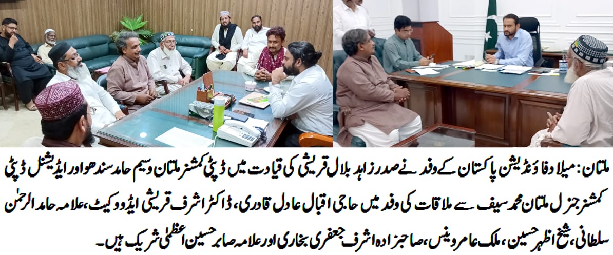 ملتان23 اگست ( لیہ ٹی وی) میلاد فاؤنڈیشن پاکستان کے وفد نے صدر زاہد بلال قریشی کی قیادت میں ڈپٹی کمشنر ملتان وسیم حامد سندھو اور ایڈیشنل ڈپٹی کمشنر جنرل ملتان محمد سیف سے انکے دفاتر میں علیحدہ علیحدہ ملاقاتیں کیں وفد کی طرف سے دونوں آفیسران کو جشن عیدمیلاد النبی ﷺکے جلوسوں و دیگر تقریبات جشن عید میلادالنبیﷺ کو درپیش مسائل کی تفصیلات سے آگاہ کیا جس پر آفیسران کی جانب سے مکمل تعاون کا یقین دلایا گیا اور موقع پر احکامات بھی صادر فرمائے وفد میں حاجی اقبال عادل قادری،ڈاکٹر اشرف قریشی ایڈووکیٹ،علامہ حامد الرحمن سلطانی، شیخ اظہر حسین، ملک عامر وینس، صاحبزادہ اشرف جعفری بخاری اور علامہ صابر حسین اعظمیٰ شریک تھے۔ملتان : میلاد فاؤنڈیشن پاکستان کے وفد نے صدر زاہد بلال قریشی کی قیادت میں ڈپٹی کمشنر ملتان وسیم حامد سندھو اور ایڈیشنل ڈپٹی کمشنر جنرل ملتان محمد سیف سے ملاقات کی وفد میں حاجی اقبال عادل قادری، ڈاکٹر اشرف قریشی ایڈووکیٹ،علامہ حامد الرحمن سلطانی، شیخ اظہر حسین، ملک عامر وینس، صاحبزادہ اشرف جعفری بخاری اور علامہ صابر حسین اعظمیٰ شریک ہیں